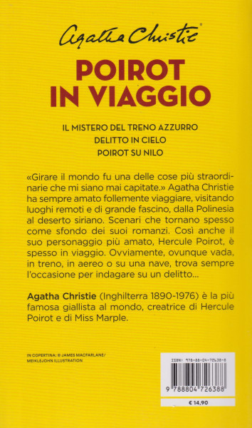 Ed e cosi che anche il suo personaggio piu amato, Hercule Poirot, e spesso in viaggio. Ovviamente, ovunque vada, in treno, in aereo o su una nave, trova un delitto su cui indagare... "Il mistero del treno azzurro" (1928) racconta un viaggio di Poirot tra Londra e la Costa Azzurra. Sul suo stesso convoglio, lussuoso ed esclusivo, viene uccisa la bella ereditiera Ruth Kettering. Chi e l'assassino? La polizia brancola nel buio, Poirot no. Il volo Parigi-Londra raccontato in "Delitto in cielo" (1935) e fatale a un'altra donna, un'anziana e ricchissima usuraia avvelenata con un colpo di cerbottana. La odiavano in tanti, ma chi puo averla uccisa? Ancora una volta la presenza del passeggero Poirot permettera di risolvere l'enigma. Poirot e finalmente in vacanza, in Egitto. Ma anche in "Poirot sul Nilo" (1937) l'investigatore non puo riposare: nel giro di poche ore a bordo del battello si consumano due delitti e la tranquilla crociera si trasforma nella disperata caccia a un assassino diabolicamente astuto.