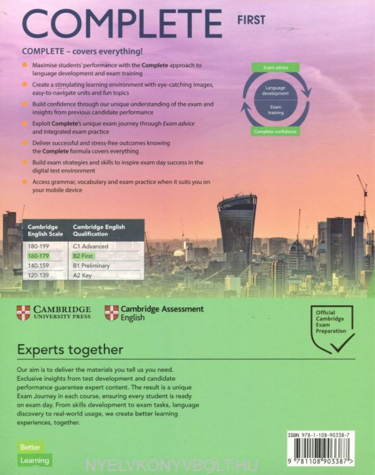 Complete is trusted by millions of candidates worldwide. This course allows you to maximise performance with the Complete approach to language development and exam training. Build confidence through our unique understanding of the exam and insights fromprevious candidate performance, and the Complete exam journey for successful and stress-free outcomes. Access the Cambridge One Digital Pack, optimised for a range of devices, for your bank of learning resources including accompanying Audio. The Workbookprovides further practice of language and vocabulary.