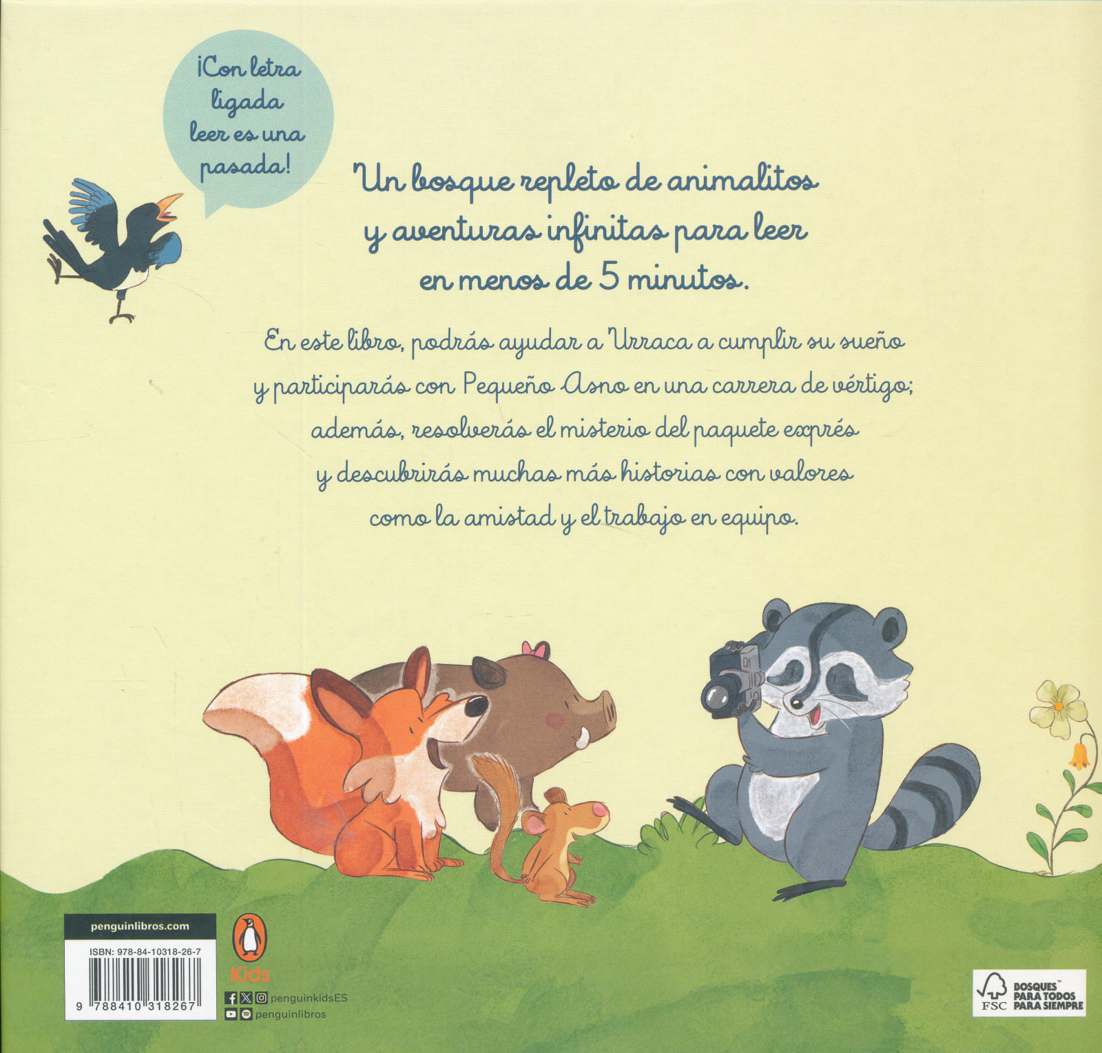 Adéntrate en un bosque repleto de animalitoscon 10 aventuras para leer en menos de 5 minutos.!Un bosque repleto de animalitos y aventuras infinitas!?Quién ha enviado un misterioso paquete exprés al bosque??Qué ocurrió el día que se apagóel sol??Se puede atrapar una estrella?Acompana a todos los animalitos del bosque en sus increíbles aventuras mientras aprendes que los suenos se pueden conseguir de la forma más inesperada.Ayuda a Urraca a cumplir su sueno, participa con Pequeno Asno y Pequena Jabalina en una carrera de vértigo, resuelve el misterio del paquete exprés y descubre muchas más historias con valores como la amistad y el trabajo en equipo.