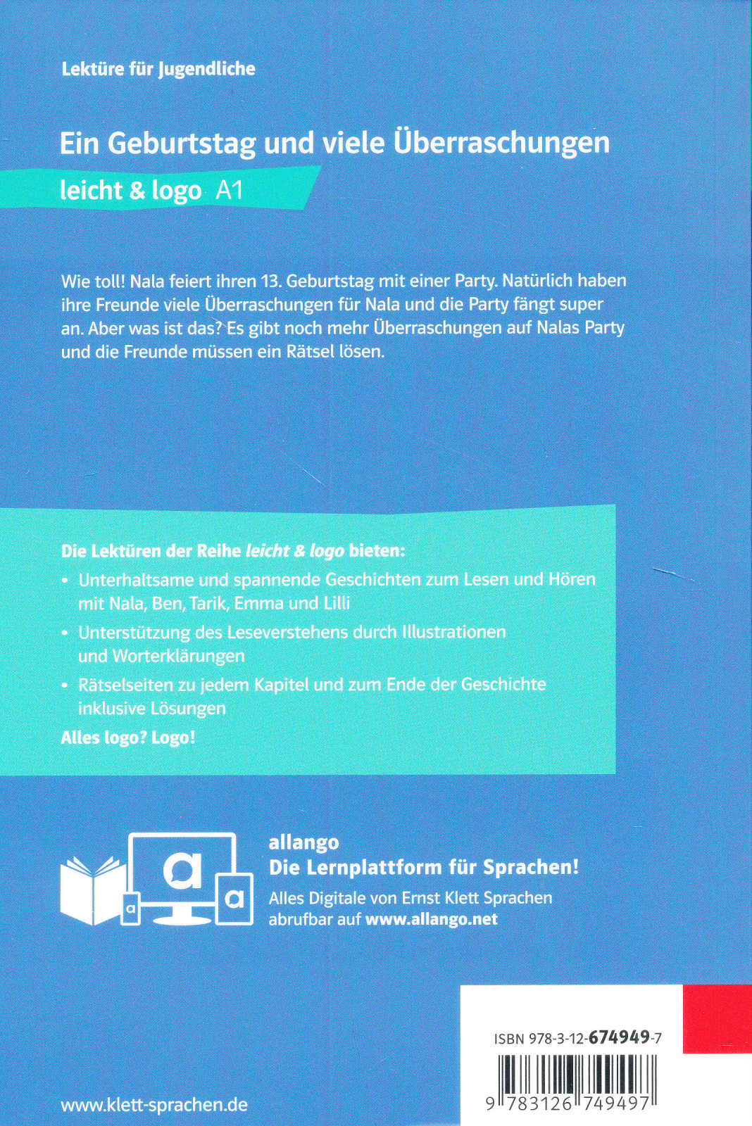 Újabb meglepetések várnak Nálára a bulin, és a barátainak egy rejtvényt is meg kell oldaniuk…leicht & logoKönnyed olvasmányok a német nyelvtanuláshozA leicht & logo olvasmányokat a következőket kínálják:Szórakoztató és izgalmas történeteket olvasásra és hallgatásra Nala, Ben, Tarik, Emma és Lilli kalandjain keresztül.Illusztrációk és szójegyzék segítik a szöveg megértésétMinden fejezethez rejtvények és feladatok tartoznak, megoldásokkal együttA szókincs és a nyelvi szerkezetek aLogo! tankönyvhöz igazodnak, de önálló olvasmányként is jól használhatók, akár a megfelelő szint végén, akár ismétlésként.