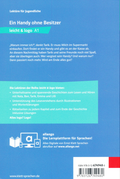 ki felejti el a telefonját és miért? Aztán még több dolog történik. Vajon a végén minden jól alakul?leicht & logoKönnyed olvasmányok a német nyelvtanuláshozA leicht & logo olvasmányokat a következőket kínálják:Szórakoztató és izgalmas történeteket olvasásra és hallgatásra Nala, Ben, Tarik, Emma és Lilli kalandjain keresztül.Illusztrációk és szójegyzék segítik a szöveg megértésétMinden fejezethez rejtvények és feladatok tartoznak, megoldásokkal együttA szókincs és a nyelvi szerkezetek a Logo! tankönyvhöz igazodnak, de önálló olvasmányként is jól használhatók, akár a megfelelő szint végén, akár ismétlésként.