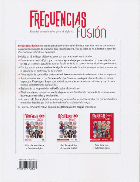 El libro está compuesto por dieciocho unidades didácticas estructuradas en ocho apartados con unos objetivos específicos:presentación de los contenidos de la unidad;activación de los conocimientos previos de los estudiantes sobre el tema;presentación y actividades para la adquisición de vocabulario;presentación y práctica de los contenidos gramaticales;secuencia comunicativa para poner en práctica los conocimientos adquiridos, a través de tareas significativas y el desarrollo de las cuatro destrezas;presentación de contenidos culturales relacionados con el universo hispánico;actividades de vídeo sobre Cartelera de cine (unidades 1-9) y Reportajes (unidades 10-18);evaluación de lo aprendido y reflexión sobre el aprendizaje.El manualse acompana de un apéndice de Pronunciación y ortografía con fichas prácticas que trabajan el componente fonético y ortográfico y que pueden presentarse en clase según las necesidades específicas de cada grupo.