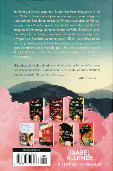 En plena Guerra Civil espanola, el joven médico Víctor Dalmau, junto a su amiga pianista Roser Bruguera, se ven obligados a abandonar Barcelona, exiliarse y cruzar los Pirineos rumbo a Francia. A bordo del Winnipeg, un navío fletado por el poeta Pablo Neruda que llevó a más de dos mil espanoles rumbo a Valparaíso, embarcarán en busca de la paz y la libertad que no tuvieron en su país. Recibidos como héroes en Chile -ese «largo pétalo de mar y nieve», en palabras del poeta chileno-, se integrarán en la vida social del país durante varias décadas hasta el golpe de Estado que derrocó al doctor Salvador Allende, amigo de Victor por su común afición al ajedrez. Víctor y Roser se encontrarán nuevamente desarraigados, pero como dice la autora: «si uno vive lo suficiente, todos los círculos se cierran».