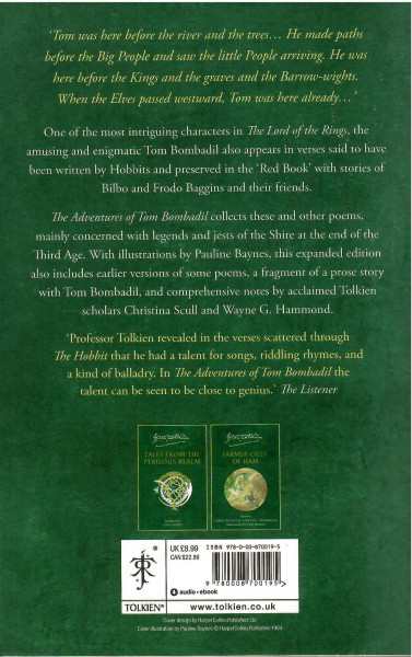 The Adventures of Tom Bombadil collects these and other poems, mainly concerned with legends and jests of the Shire at the end of the Third Age. This special edition has also been expanded to include earlier versions of some poems, a fragment of a prosestory with Tom Bombadil, and comprehensive notes by acclaimed Tolkien scholars Christina Scull and Wayne G. Hammond.