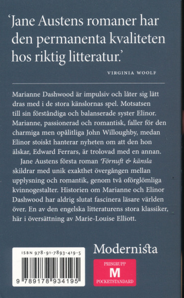 Marianne, passionerad och romantisk, faller för den charmiga men opalitliga John Willoughby, medan Elinor stoiskt hanterar nyheten om att den hon älskar, Edward Ferrars, är trolovad med en annan.Jane Austens första roman Förnuft & känsla skildrar med unik exakthet övergangen mellan upplysning och romantik, genom tva oförglömliga kvinnogestalter. Historien om Marianne och Elinor Dashwood har aldrig slutat fascinera läsare världen över. En av den engelska litteraturens stora klassiker, här i översättning av Marie-Louise Elliott.JANE AUSTEN [1775-1817] var en engelsk författare, född i Steventon, Hampshire. Hennes romaner var realistiska, bitande ironiska skildringar av den engelska överklassen och inte minst kvinnans roll i den. I dag räknas hon till en av de största brittiska romanförfattarna genom tiderna. Mest berömda är kanske romanerna Förnuft & känsla [Sense & Sensibility, 1811], Stolthet & fördom [Pride & Prejudice, 1813] och den postuma Övertalning [Persuasion, 1818], men den i dag mest kr