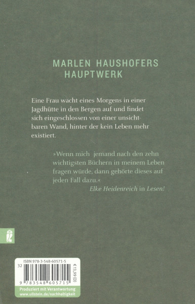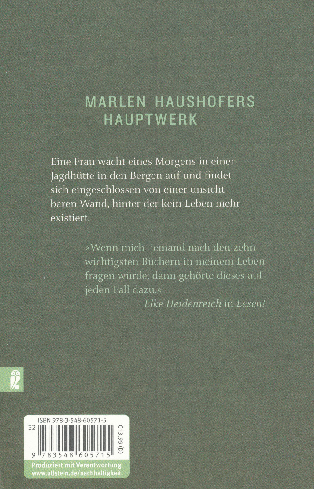 Marlen Haushofers Hauptwerk Eine Frau wacht eines Morgens in einer Jagdhütte in den Bergen auf und findet sich eingeschlossen von einer unsichtbaren Wand, hinter der kein Leben mehr existiert.