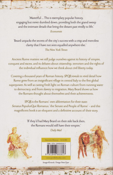 And its debates about citizenship, security and the rights of the individual still influence our own debates on civil liberty today.SPQR is a new look at Roman history from one of the world's foremost classicists. It explores not only how Rome grew from an insignificant village in central Italy to a power that controlled territory from Spain to Syria, but also how the Romans thought about themselves and their achievements, and why they are still important to us. Covering 1,000 years of history, andcasting fresh light on the basics of Roman culture from slavery to running water, as well as exploring democracy, migration, religious controversy, social mobility and exploitation in the larger context of the empire, this is a definitive history of ancient Rome.SPQR is the Romans' own abbreviation for their state: Senatus Populusque Romanus, 'the Senate and People of Rome'.