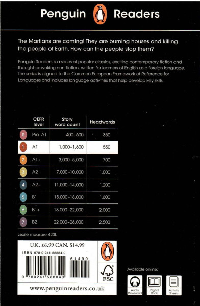 The War of the Worlds, a Level 1 Reader, is A1 in the CEFR framework. Short sentences contain a maximum of two clauses, introducing the past simple tense and some simple modals, adverbs and gerunds. Illustrations support the text throughout, and many titles at this level are graphic novels.