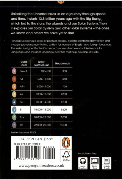 Visit the Penguin Readers websiteExclusively with the print edition, readers can unlock online resources including a digital book, audio edition, lesson plans and answer keys.Unlocking the Universe takes us on a journey through space and time. It starts 13.8 billion years ago with the Big Bang, which led to the stars, the planets and our Solar System. Then it explores our Solar System and other solar systems - the ones we know, and others we have yet to find.