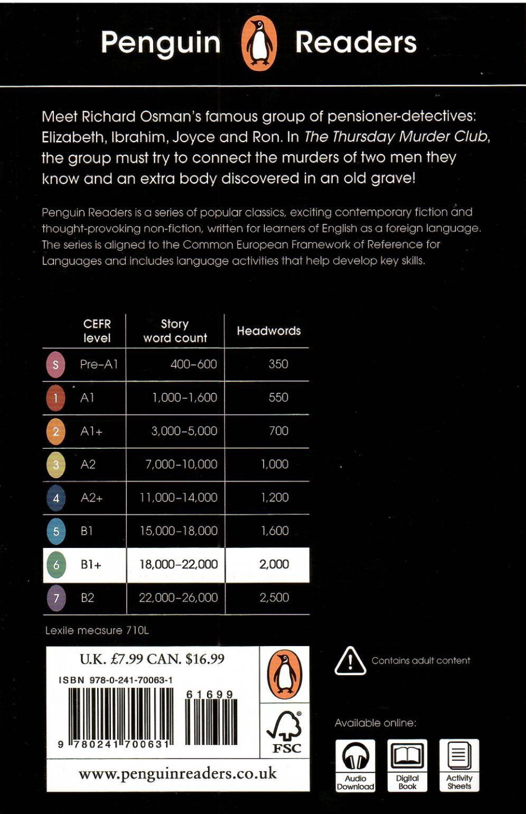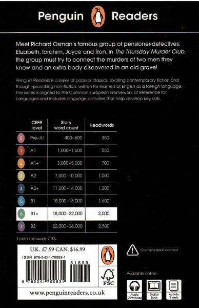 The Thursday Murder Club, a Level 6 Reader, is B1+ in the CEFR framework. The longer text is made up of sentences with up to four clauses, introducing future continuous, reported questions, third conditional, was going to and ellipsis. A small number ofillustrations support the text.