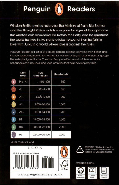 In this story Winston Smith re-writes history for the Ministry of Truth in Oceania. Big Brother and the Thought Police watch everyone for signs of Thought Crime. But when Winston falls in love with Julia, he begins to have new ideas and hopes. Winston and Julia start to question the world that they live in - but Big Brother does not like independent thought.Our Penguin Readers books include:Simple text (CEFR-levelled)Pictures to help you understand the storyFun exercises to help you learn and practise EnglishWith the print book, you can get even more help online:Read the book onlineListen to the book being read out loudGet lesson plans for teachersFind answers to check your understanding