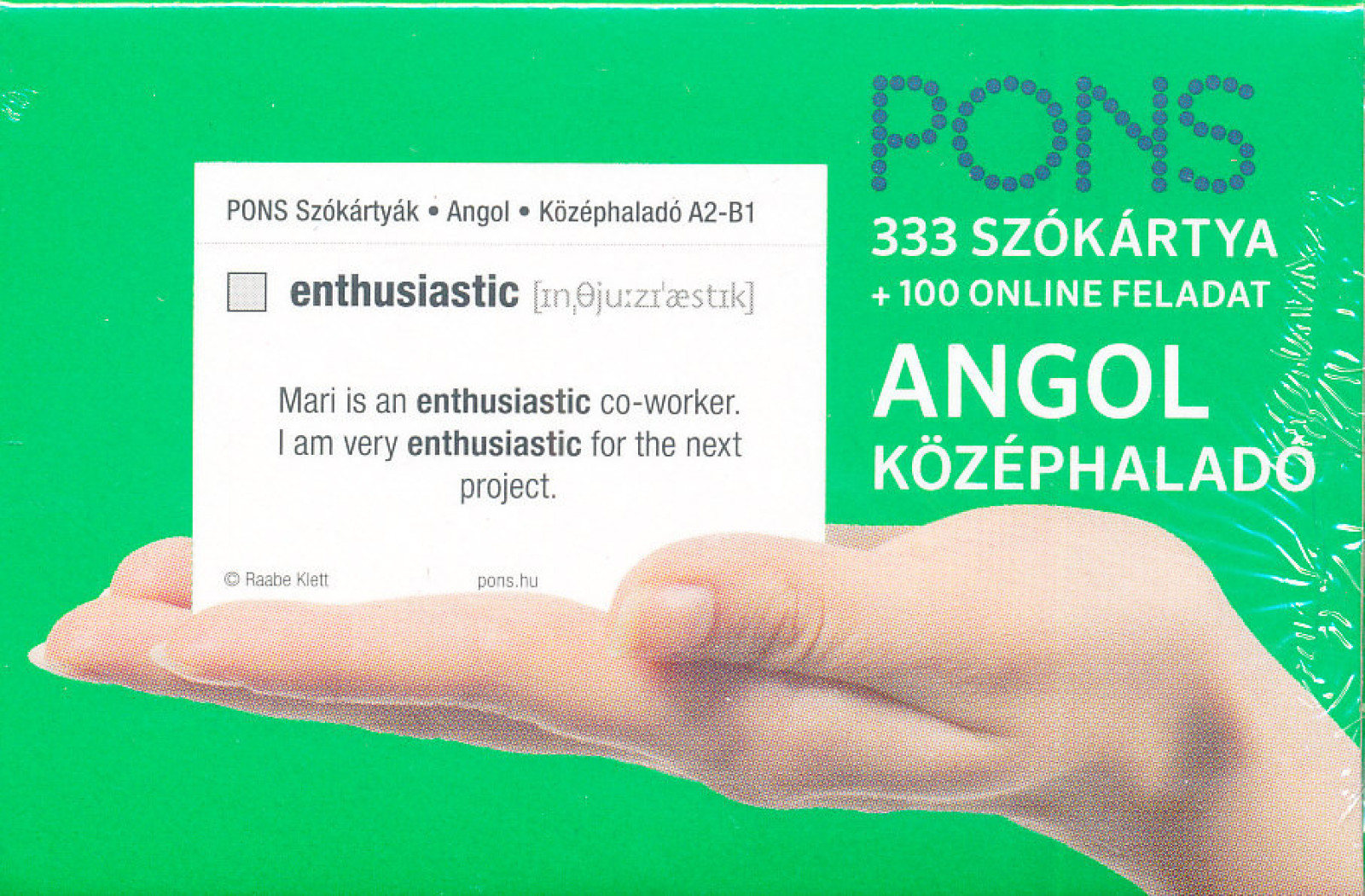 Bármely korosztálynak érdekes és hasznos kifejezések példamondatokkal és azok magyar megfelelőivel.A megtanult szavak a hosszú távú memóriádba kerülnek.Napi 10 perc gyakorlással is hatalmas fejlődést érhetsz el.Tudásodat ellenőrizheted 5×20 onlineteszttel.100 ONLINE TESZT: Elég sokat forgattad már a kártyákat? Úgy érzed, hogy jól mennek a kifejezések? Menj fel a https://www.pons.hu/pons-szokartyak-angol-kozephalado-online-feladatok oldalra, írd be a jelszót, és már választhatsz is, hogy melyikfeladattípussal teszteled a tudásodat. Ellenőrizheted például feleletválasztóssal, igaz/hamis-sal vagy kiegészítendő mondatokkal. Természetesen a helyes megoldásokat is azonnal láthatod.