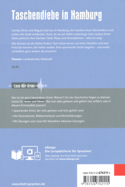 pénz, útlevelek, okostelefonok. Hogyan találhatják meg a tolvajokat? Szerencsére megismerkednek egy nyomozóval és egy rendőrnővel, akik segíteni akarnak nekik. Izgalmas nyomozás veszi kezdetét, amely végül egészen másként ér véget, mint ahogy bárki gondolta volna!Lese-Hör-KrimiEz egy igazán különleges detektívtörténet – de miért is? Mert a történetet csak úgy követheted, ha olvasol és hallgatsz is. Csak az tudja meg, mi történik valójában ebben a bűnügyben, aki mindent elolvasott és meghallgatott.Izgalmas krimi, amely részben olvasva, részben hallgatva bontakozik kiIllusztrációkkal, képes szótárral és szójegyzékkelOlvasásértési és hallásértési feladatokkal, megoldókulccsal