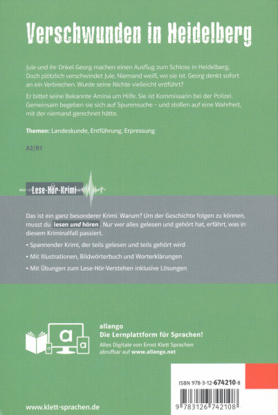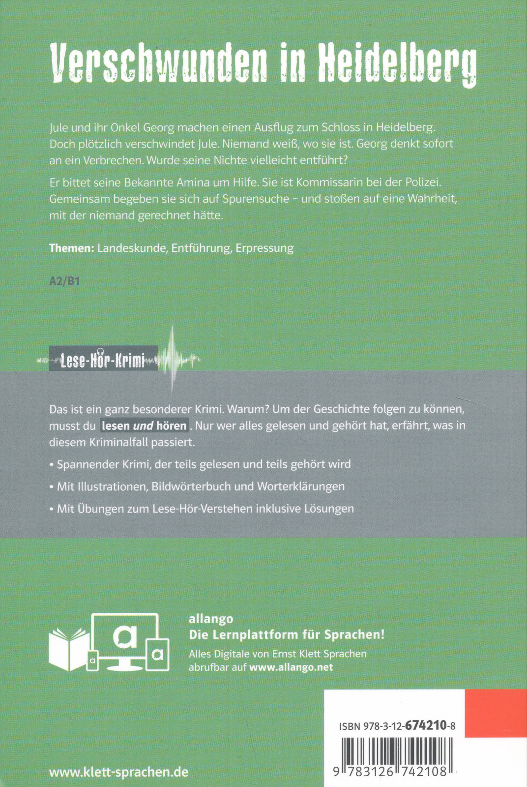 Vajon elrabolták az unokahúgát? Segítséget kér ismerősétől, Aminától, aki a rendőrségnél dolgozik nyomozóként. Együtt indulnak el nyomozni, és egy olyan igazságra bukkannak, amire senki sem számított.Lese-Hör-KrimiEz egy igazán különleges detektívtörténet – de miért is? Mert a történetet csak úgy követheted, ha olvasol és hallgatsz is. Csak az tudja meg, mi történik valójában ebben a bűnügyben, aki mindent elolvasott és meghallgatott.Izgalmas krimi, amely részben olvasva, részben hallgatva bontakozik kiIllusztrációkkal, képes szótárral és szójegyzékkelOlvasásértési és hallásértési feladatokkal, megoldókulccsal