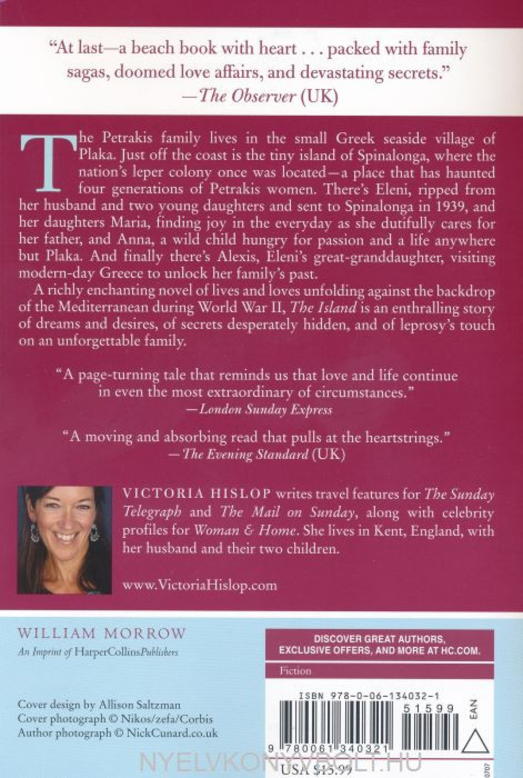 There's Eleni, ripped from her husband and two young daughters and sent to Spinalonga in 1939, and her daughters Maria, finding joy in the everyday as she dutifully cares for her father, and Anna, a wild child hungry for passion and a life anywhere butPlaka. And finally there's Alexis, Eleni's great-granddaughter, visiting modern-day Greece to unlock her family's past.A richly enchanting novel of lives and loves unfolding against the backdrop of the Mediterranean during World War II, The Island isan enthralling story of dreams and desires, of secrets desperately hidden, and of leprosy's touch on an unforgettable family.