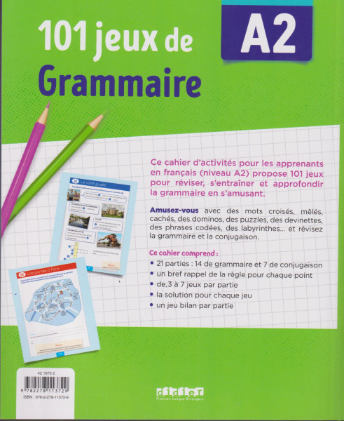 Ce cahier d’activités pour les apprenants (adolescents et adultes) en français (niveau A2) propose 101 jeux pour réviser, s’entraîner et approfondir la grammaire en s’amusant.<Enter> <Enter>