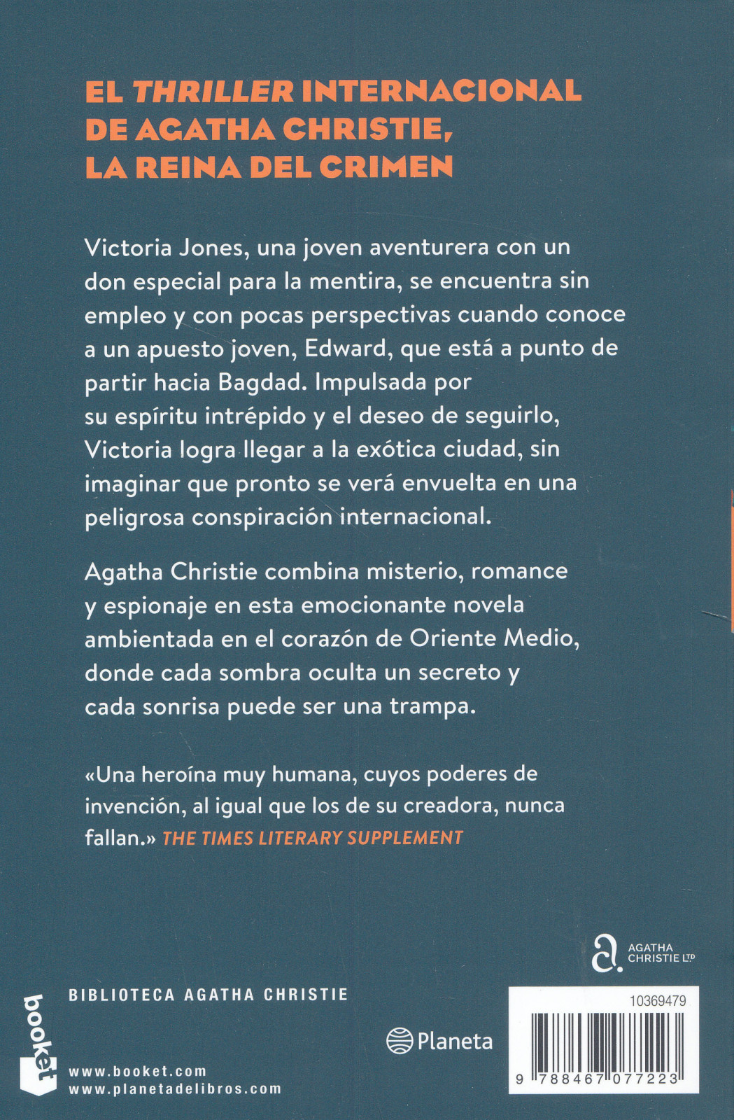Victoria Jones, una joven aventurera con un don especial para la mentira, se encuentra sin empleo y con pocas perspectivas cuando conoce a un apuesto diplomático, Edward, que está a punto de partir hacia Bagdad. Impulsada por su espíritu intrépido y el deseo de seguirlo, Victoria logra llegar a la exótica ciudad, sin imaginar que pronto se verá envuelta en una peligrosa conspiración internacional.Agatha Christie combina misterio, romance y espionaje en esta emocionante novela ambientada en el corazón de Oriente Medio, donde cada sombra oculta un secreto y cada sonrisa puede ser una trampa.