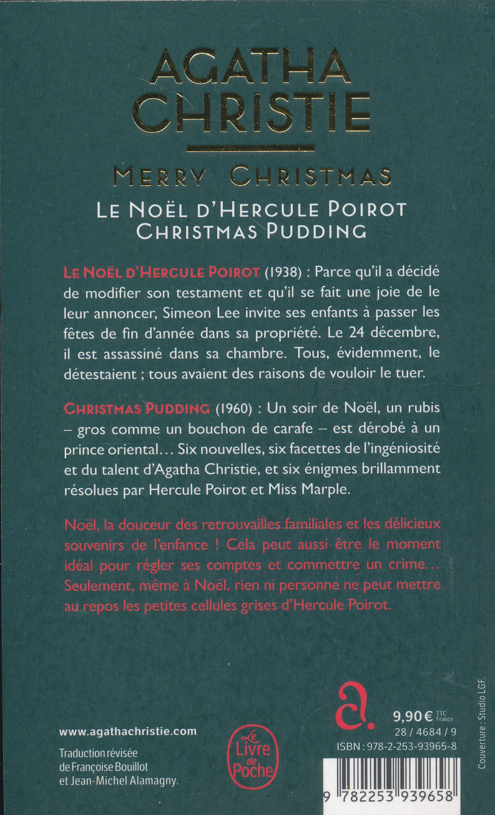 Le Noël d’Hercule Poirot (1938) : Parce qu’il a décidé de modifier son testament et qu’il se fait une joie de leur annoncer, Simeon Lee invite ses enfants a passer les fetes de fi n d’année dans sa propriété. Le 24 décembre, il est assassiné dans sa chambre. Tous, évidemment, le détestaient ; tous avaient des raisons de vouloir le tuer.Christmas pudding (1960) : Un soir de Noël, un rubis – gros comme un bouchon de carafe – est dérobé a un prince oriental… Six nouvelles, six facettes de l’ingéniosité et du talent d’Agatha Christie, et six énigmes brillamment résolues par Hercule Poirot et Miss Marple.