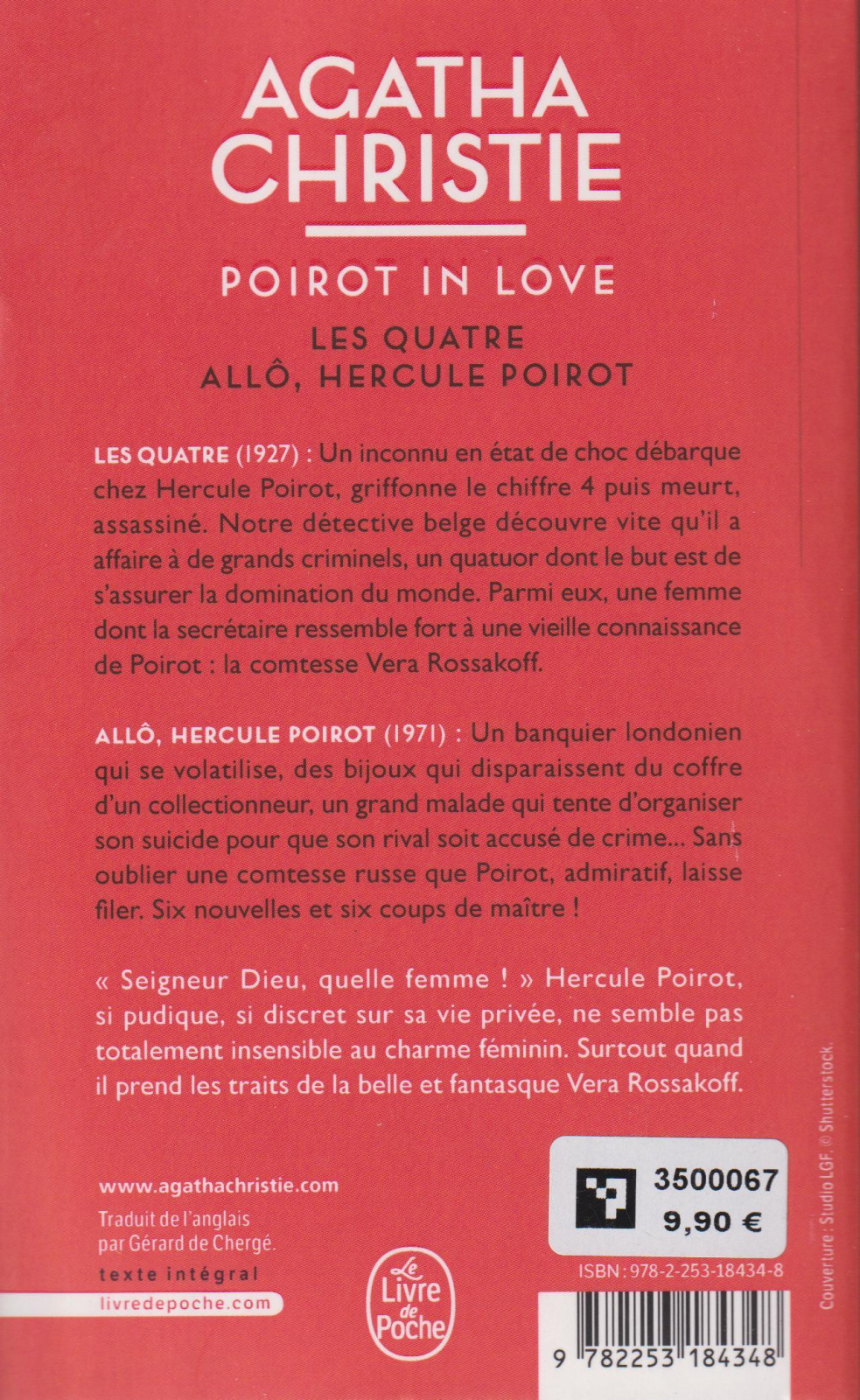 Les Quatre (1927) : Un inconnu en état de choc débarque chez Hercule Poirot, griffonne le chiffre 4 puis meurt, assassiné. Notre détective belge découvre vite qu’il a affaire a de grands criminels, un quatuor dont le but est de s’assurer la domination du monde. Parmi eux, une femme dont la secrétaire ressemble fort a une vieille connaissance de Poirot : la comtesse Véra Rossakoff.Allô Hercule Poirot (1971) : Un banquier londonien qui se volatilise, des bijoux qui disparaissent du coffre d’un collectionneur, un grand malade qui tente d’organiser son suicide pour que son rival soit accusé de crime... Sans oublier une comtesse russe que Poirot, admiratif, laisse filer. Six nouvelles et six coups de maître ! « Seigneur dieu, quelle femme ! »Hercule Poirot, si pudique, si discret sur sa vie privée, ne semble pas totalement insensible au charme féminin. Surtout quand il prend les traits de la belle et fantasque Véra Rossakoff.