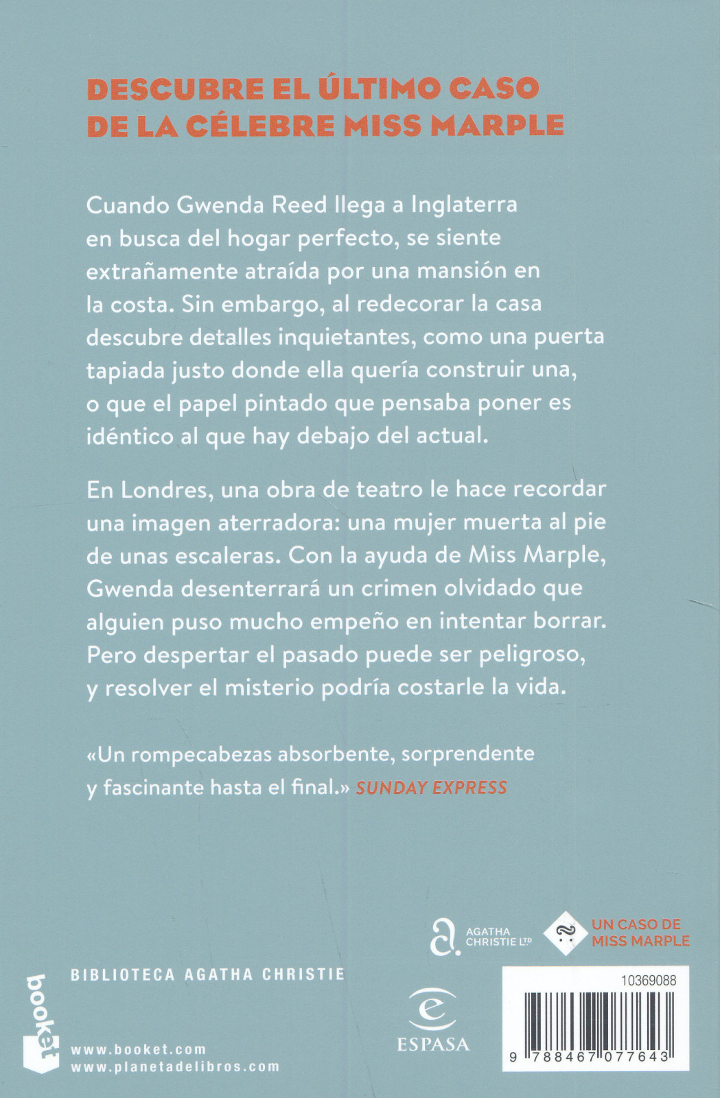 Cuando Gwenda Reed llega a Inglaterra en busca de la casa perfecta, se siente extranamente atraída por una mansión en la costa. Sin embargo, pronto descubre detalles inquietantes, como un papel floral que creía haber elegido y que ya estaba allí, o una puerta tapiada justo donde ella quería construir una.En Londres, tras una obra de teatro, un recuerdo la aterra: una mujer muerta al pie de unas escaleras. Con la ayuda de Miss Marple, Gwenda desentierra un crimen olvidado que alguien quiso borrar. Pero despertar el pasado puede ser peligroso, y resolver el misterio podría costarle la vida.