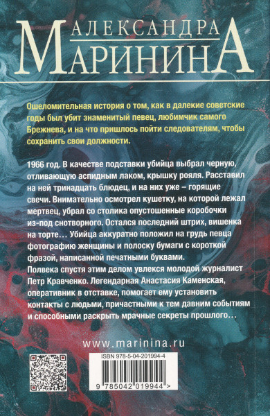 1966 god. V kachestve podstavki ubijtsa vybral chernuju, otlivajuschuju aspidnym lakom kryshku rojalja. Rasstavil na nej trinadtsat bljudets, i na nikh uzhe - gorjaschie svechi. Vnimatelno osmotrel kushetku, na kotoroj lezhal mertvets, ubral so stolikaopustoshennye korobochki iz-pod snotvornogo. Ostalsja poslednij shtrikh, vishenka na torte... Ubijtsa akkuratno polozhil na grud pevtsa fotografiju zhenschiny i polosku bumagi s korotkoj frazoj, napisannoj pechatnymi bukvami. Polveka spustja etim delom uvleksja molodoj zhurnalist Petr Kravchenko. Legendarnaja Anastasija Kamenskaja, operativnik v otstavke, pomogaet emu ustanovit kontakty s ljudmi, prichastnymi k tem davnim sobytijam i sposobnymi raskryt mrachnye sekrety proshlogo...