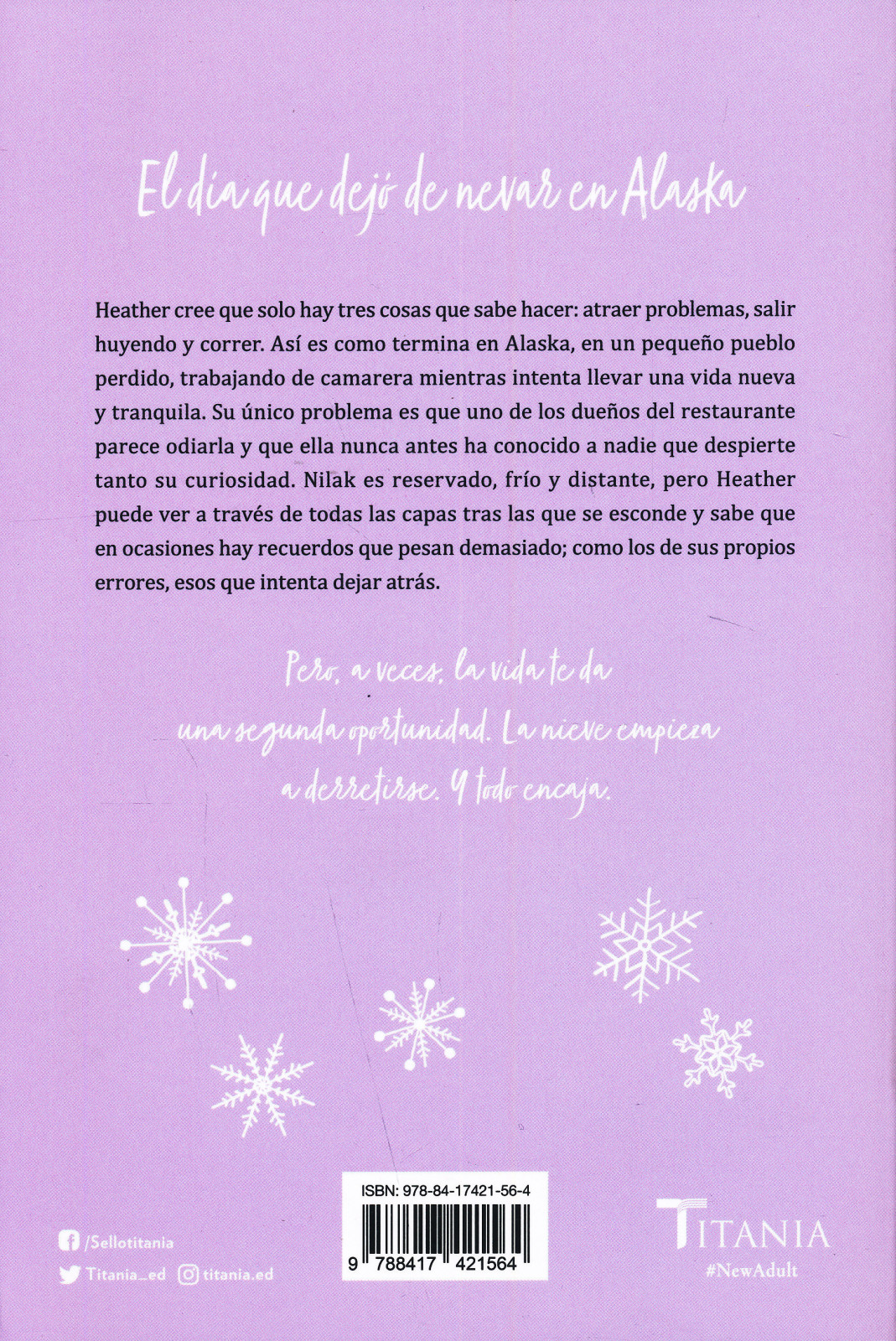Heather cree que solo hay tres cosas que sabe hacer: atraer problemas, salir huyendo y correr. Así es como termina en Alaska, en un pequeno pueblo perdido, trabajando de camarera mientras intenta llevar una vida nueva y tranquila. Su único problema es que uno de los duenos del restaurante parece odiarla y que ella nunca antes ha conocido a nadie que despierte tanto su curiosidad. Nilak es reservado, frío y distante, pero Heather puede ver a través de todas las capas tras las que se esconde y sabe que en ocasiones hay recuerdos que pesan demasiado; como los de sus propios errores, esos que intenta dejar atrás.Pero, a veces, la vida te da una segunda oportunidad.La nieve empieza a derretirse.