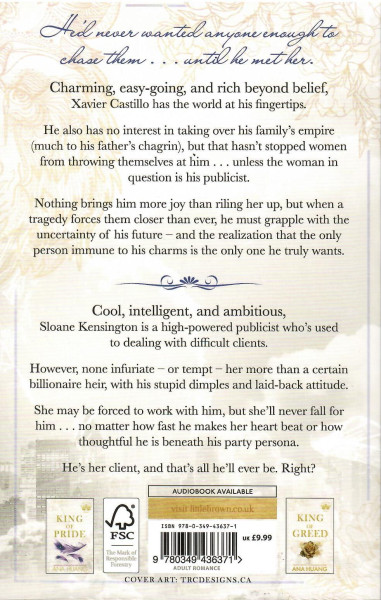 Charming, easy-going, and rich beyond belief, Xavier Castillo has the world at his fingertips.He also has no interest in taking over his family's empire (much to his father's chagrin), but that hasn't stopped women from throwing themselves at him . . . unless the woman in question is his publicist.Nothing brings him more joy than riling her up, but when a tragedy forces them closer than ever, he must grapple with the uncertainty of his future - and the realization that the only person immune tohis charms is the only one he truly wants.