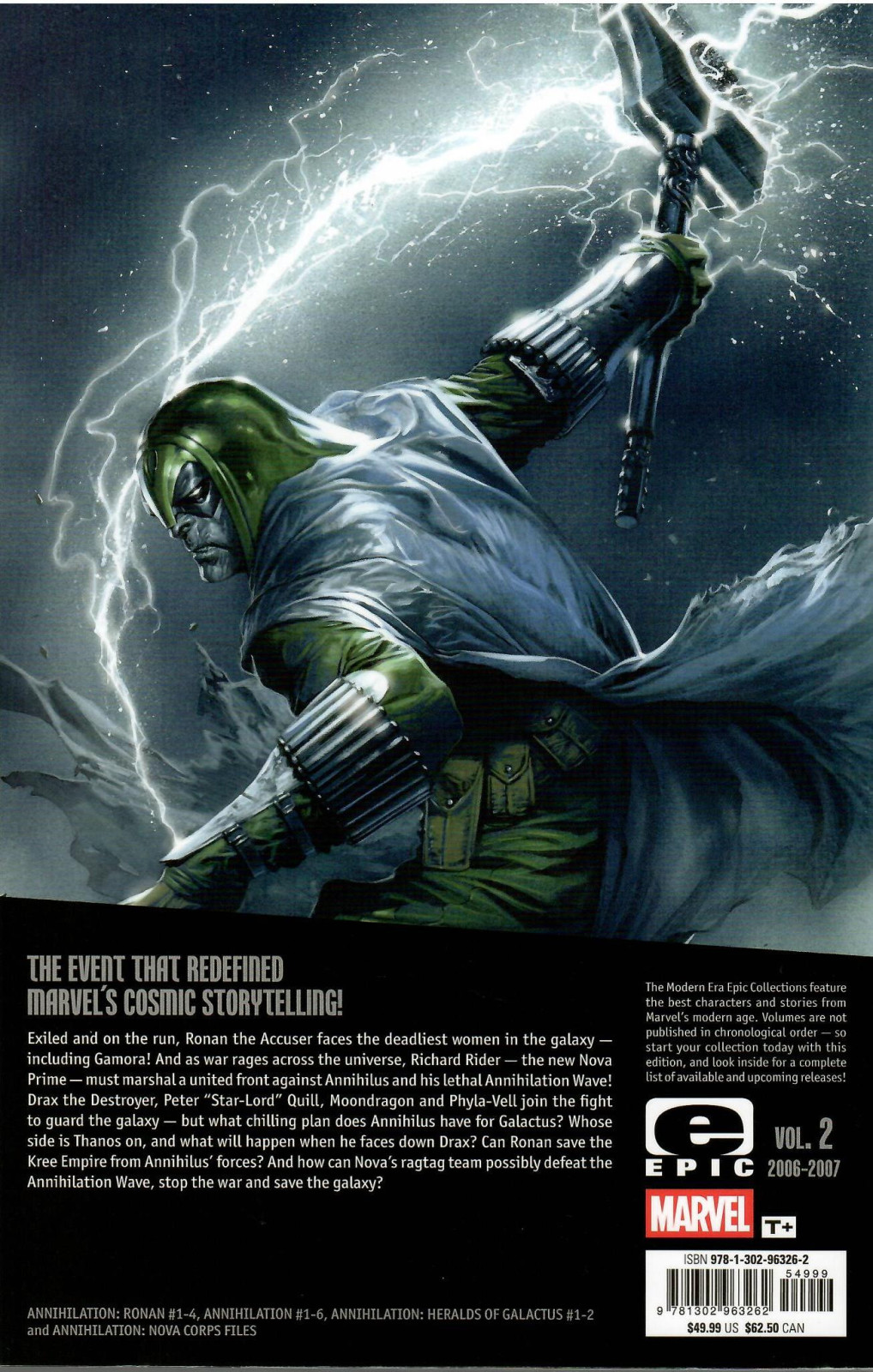 Exiled and on the run, Ronan the Accuser faces the deadliest women in the galaxy — including Gamora! And as war rages across the universe, Richard Rider — the new Nova Prime — must marshal a united front against Annihilus and his lethal Annihilation Wave! Drax the Destroyer, Peter “Star-Lord” Quill, Moondragon and Phyla-Vell join the fight to guard the galaxy — but what chilling plan does Annihilus have for Galactus? Whose side is Thanos on, and what will happen when he faces down Drax? Can Ronan save the Kree Empire from Annihilus’ forces? And how can Nova’s ragtag team possibly defeat the Annihilation Wave, stop the war and save the galaxy?