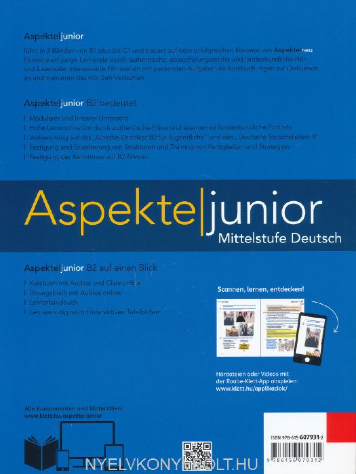 Das Kursbuch zu Aspekte junior B2festigt und erweitert Strukturen und trainiert Fertigkeiten und Strategienbereitet auf das Zertifikat B2 und die Formate des DSDII vorenthält attraktive Auftaktseiten und spannende landeskundliche Porträtsmotiviert die Lernenden durch authentische Filme auf der DVDenthält alle Hörtexte im mp3-Format zum Download