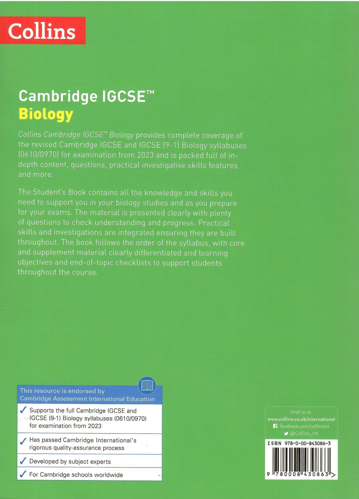 Collins Cambridge IGCSETM Biology provides complete coverage of the revised Cambridge IGCSE Biology syllabus (0610/0970) for examination from 2023 and is packed full of questions, in depth content, practical investigative skills features and more.