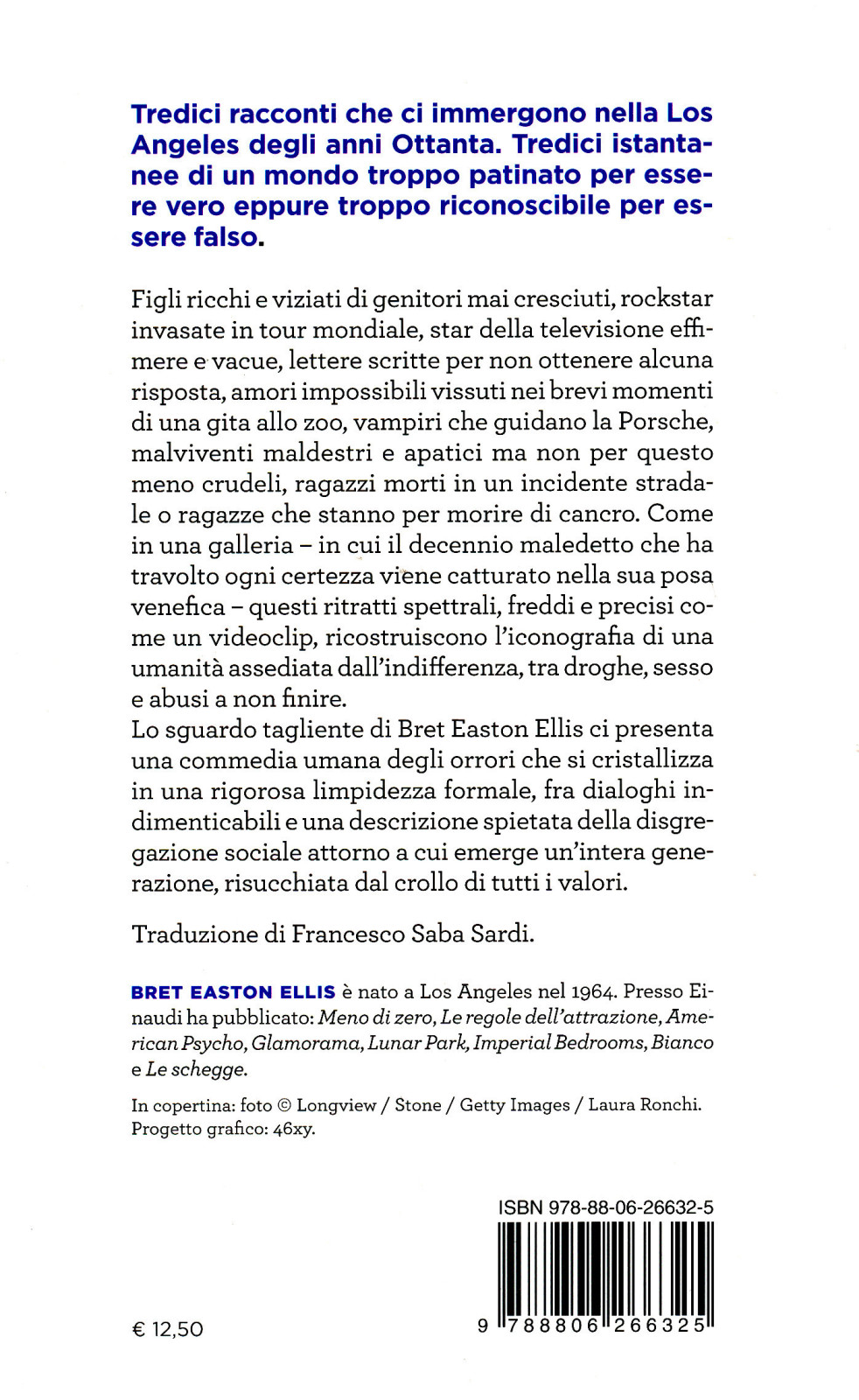 Giovani ricchi e viziati, genitori mai cresciuti, rockstar invasate, star effimere e vacue, arriviste piene di "buona volonta": come in una sfilata di mostri, sotto le luci frastornanti di una realta televisionata, gli anni Ottanta mostrano in questi racconti il loro lato peggiore, quello di un benessere improvviso che si annega nel nichilismo, di infiniti piaceri che si succedono in vite sottovuoto