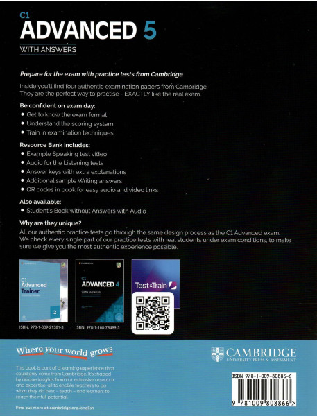 Inside C1 Advanced 5 you'll find four complete examination papers from Cambridge University Press & Assessment. Be confident on exam day by working through each part of the exam and scoring system so you can familiarise yourself with the format and practise your exam technique. The book contains transcripts, sample Writing answers, scripts for the Speaking test, and sample answer sheets. Download the audio for the Listening tests, example Speaking test video and answer keys with extra explanations (instructions on inner front cover), or access your audio and video directly via QR codes in the book.