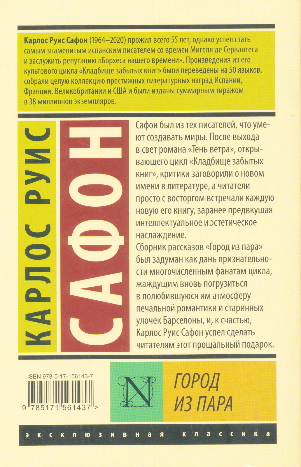 Safon byl iz tekh pisatelej, chto umejut sozdavat miry. Posle vykhoda v svet romana "Ten vetra", otkryvajuschego tsikl "Kladbische zabytykh knig", kritiki zagovorili o novom imeni v literature, a chitateli prosto s vostorgom vstrechali kazhduju novuju ego knigu, zaranee predvkushaja intellektualnoe i esteticheskoe naslazhdenie. Sbornik rasskazov "Gorod iz para" byl zaduman kak dan priznatelnosti mnogochislennym fanatam tsikla, zhazhduschim vnov pogruzitsja v poljubivshujusja im atmosferu pechalnoj romantiki i starinnykh ulochek Barselony, i, k schastju, Karlos Ruis Safon uspel sdelat chitateljam etot proschalnyj podarok.