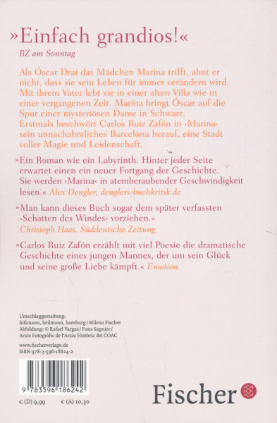 Schmerz und Trauer, Wut und Größenwahn reißen sie mit sich, eine höllische Verbindung von vernichtender Kraft. Aber auch Marina umgibt ein Geheimnis. Als Óscar schließlich dahinterkommt, ist es das jähe Ende seiner Jugend.In >Marina< beschwört CarlosRuiz Zafón erstmals sein unnachahmliches Barcelona herauf, eine Stadt voller Magie und Leidenschaft, und erzählt in unvergleichlicher Weise die dramatische Geschichte eines jungen Mannes, der um sein Glück und seine große Liebe kämpft.