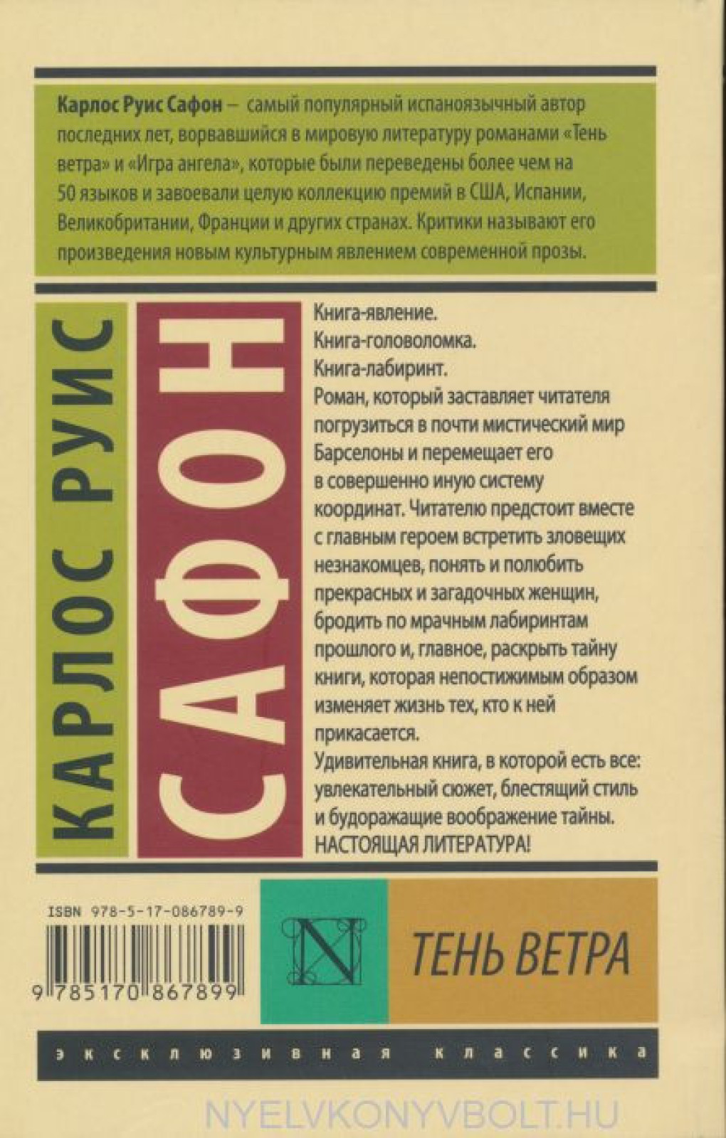 Kniga-javlenie.<Enter>Kniga-golovolomka.<Enter>Kniga-labirint.<Enter>Roman, kotoryj zastavljaet chitatelja pogruzitsja v pochti misticheskij mir Barselony i peremeschaet ego v sovershenno inuju sistemu koordinat.