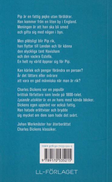 Pip bor i en liten by i England. Han är en fattig pojke utan föräldrar. Meningen är att han ska bli smed och gifta sig med nagon i byn.Men plötsligt blir Pip rik. En helt ny värld öppnar sig för honom. Han flyttar till London och lär känna den olyckliga tant Havisham och den vackra Estella.Kan kärlek och pengar förändra en person? Är det lättare eller svarare att vara en god människa när man är rik?Charles Dickens var en populär brittisk författare som levde pa 1800-talet. Lysande utsikter ären av hans mest kända böcker. Dickens berättelser har ofta sjävbiografiska inslag. Hans egen uppväxt var ocksa fattig. Han hatade orättvisor och brydde sig mycket om dem som hade det svart.