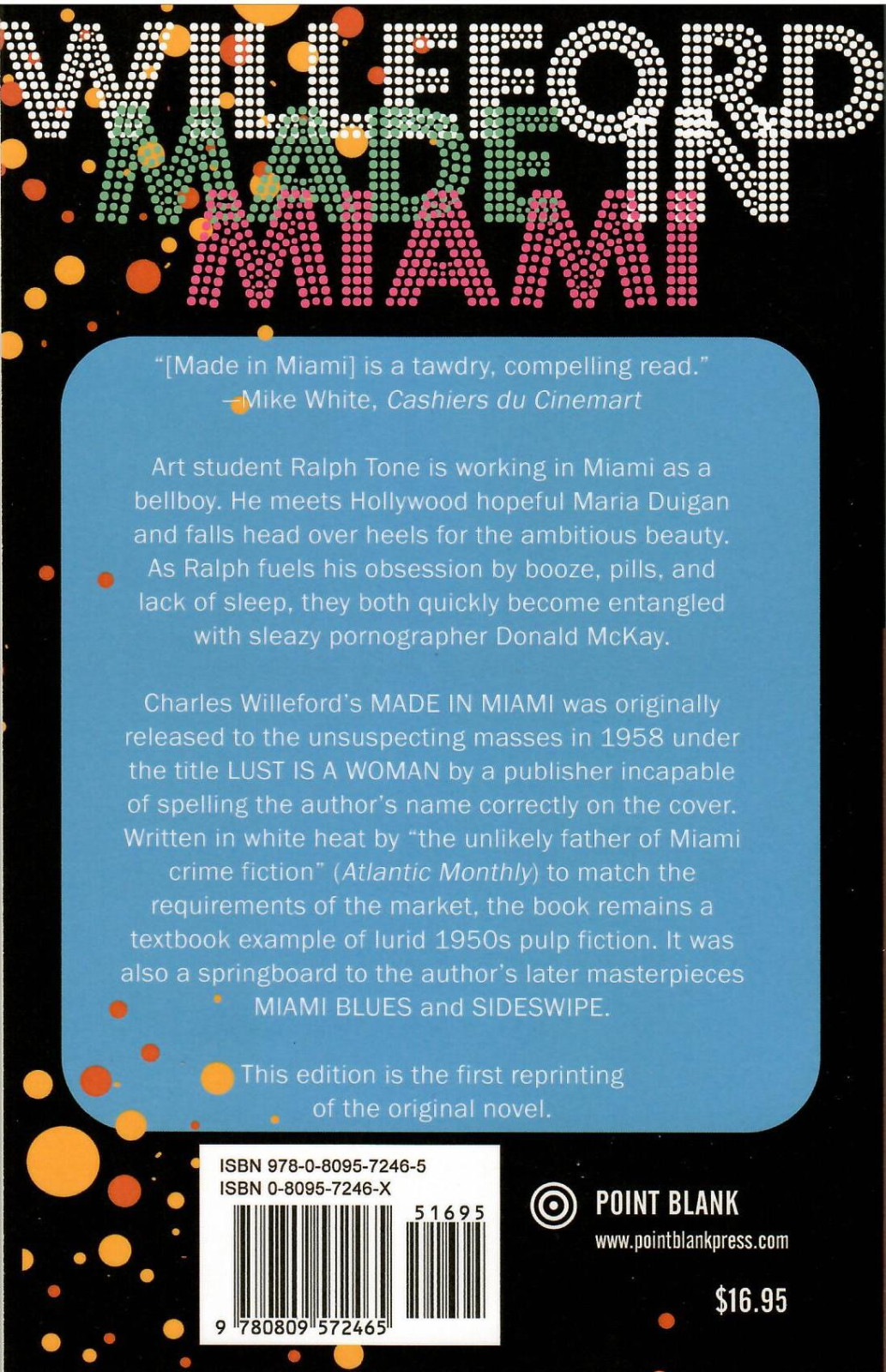 As Ralph fuels his obsession by booze, pills, and lack of sleep, they both quickly become entangled with sleazy pornographer Donald McKay. Charles Willeford's MADE IN MIAMI was originally released to the unsuspecting masses in 1958 under the title LUST IS A WOMAN by a publisher incapable of spelling the author's name correctly on the cover. Written in white heat by "the unlikely father of Miami crime fiction" (Atlantic Monthly) to match the requirements of the market, the book remains a textbook example of lurid 1950s pulp fiction. It was also a springboard to the author's later masterpieces MIAMI BLUES and SIDESWIPE.
