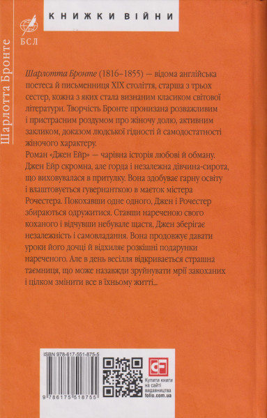 Sharlotta Bronte (1816-1855) - vidoma anglijska poetesa j pismennitsja XIX stolittja, starsha z trokh sester, kozhna z jakikh stala viznanim klasikom svitovoji literaturi. Tvorchist Bronte pronizana rozvazhlivim i pristrasnim rozdumom pro zhinochu dolju, aktivnim zaklikom, dokazom ljudskoji gidnosti j samodostatnosti zhinochogo kharakteru.Roman "Dzhen Ejr" - charivna istorija ljubovi j obmanu. Dzhen Ejr skromna, ale gorda i nezalezhna divchina-sirota, scho vikhovuvalasja v pritulku. Vona zdobuvaje garnu osvitu i vlashtovujetsja guvernantkoju v majetok mistera Rochestera. Pokokhavshi odin odnogo, Dzhen i Rochester zbirajutsja odruzhitisja. Stavshi narechenoju svogo kokhanogo i vidchuvshi nebuvale schastja, Dzhen zberigaje nezalezhnist i samovladannja. Vona prodovzhuje davati uroki jogo dochtsi j vidkhiljaje rozkishni podarunki narechenogo. Ale v den vesillja vidkrivajetsja strashna tajemnitsja, scho mozhe nazavzhdi zrujnuvati mriji zakokhanikh i tsilkom zminiti vse v jikhnomu zhitti...