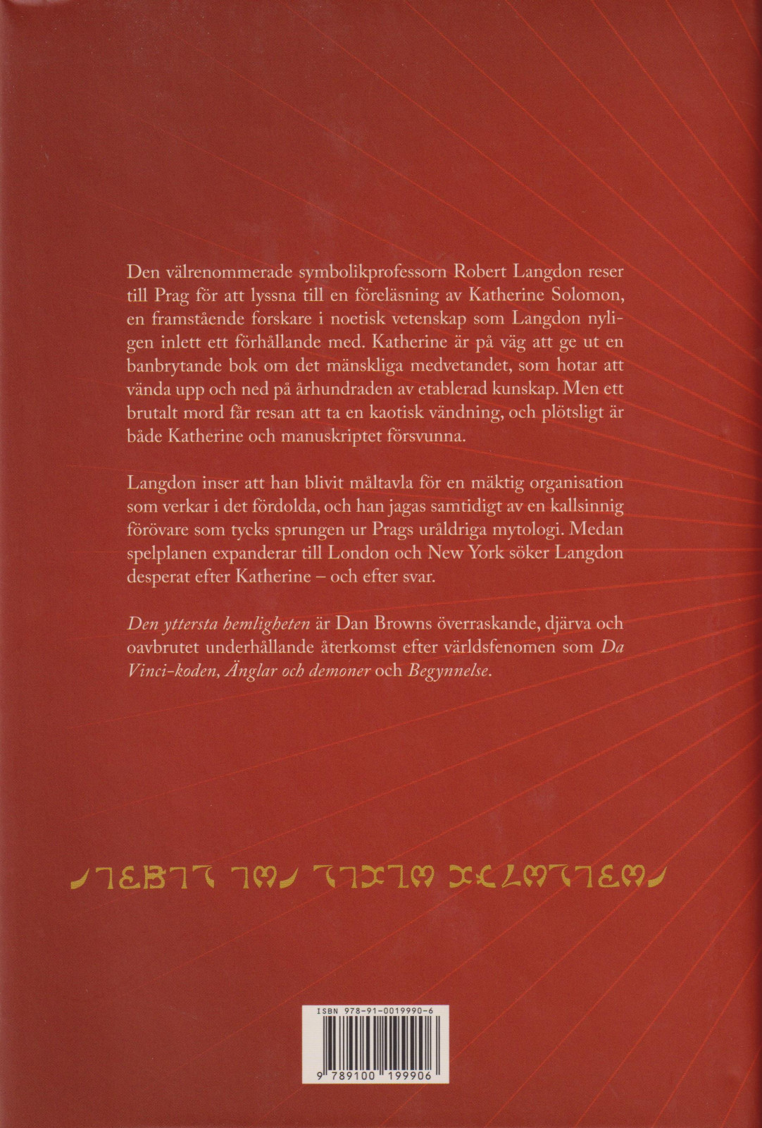 Katherine är pa väg att ge ut en banbrytande bok om det mänskliga medvetandet, som hotar att vända upp och ned pa arhundraden av etablerad kunskap. Men ett brutalt mord far resan att ta en kaotisk vändning, och plötsligt är bade Katherine och manuskriptet försvunna.Langdon inser att han blivit maltavla för en mäktig organisation som verkar i det fördolda, och han jagas samtidigt av en kallsinnig förövare som tycks sprungen ur Prags uraldriga mytologi. Medan spelplanen expanderar till London och New York söker Langdon desperat efter Katherine - och efter svar. Det blir en gastkramande kapplöpning genom den futuristiska vetenskapens och den mystiska folktrons olika världar, en jakt som leder Langdon till en chockerande upptäckt om ett topphemligt projekt som för alltid ska förändra hur vi ser pa det mänskliga medvetandet.