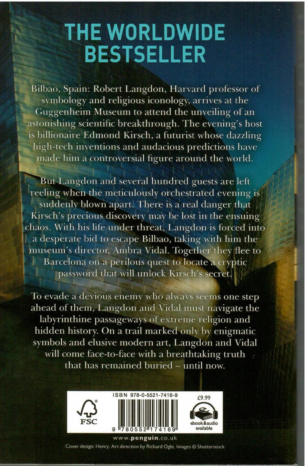 Robert Langdon, Harvard professor of symbology and religious iconology, arrives at the Guggenheim Museum Bilbao to attend the unveiling of a discovery that “will change the face of science forever”. The evening’s host is his friend and former student, Edmond Kirsch, a forty-year-old tech magnate whose dazzling inventions and audacious predictions have made him a controversial figure around the world. This evening is to be no exception: he claims he will reveal an astonishing scientific breakthrough to challenge the fundamentals of human existence...