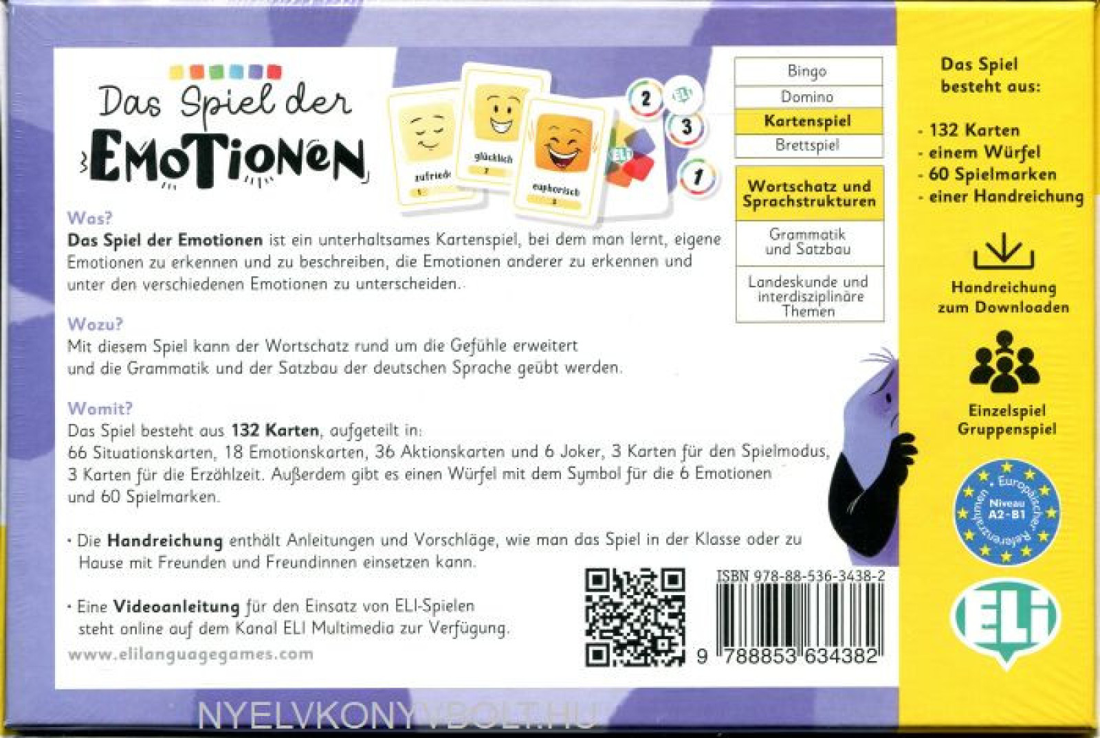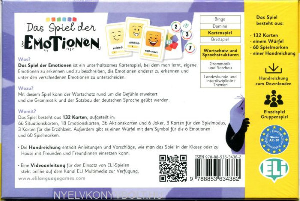 Das Spiel besteht aus 132 Karten: 66 illustrierte Situationskarten, 18Emotionskarten, unterteilt in 6 Kategorien, die drei Abstufungen dereinzelnen Gefühle enthalten, 42 illustrierte Aktionskarten, unterteilt in 6 Stapel mit Karten unterschiedlicherFarben (6 Karten für jedes Gefühl plus ein Joker). 3 Karten, die den Spielmodus bestimmen: DAS THERMOMETER DER EMOTIONEN, WAS MACHST DU, WENN DU … BIST?, ERZÄHLE (Was?Wann? Wo? Mit wem? Warum?)