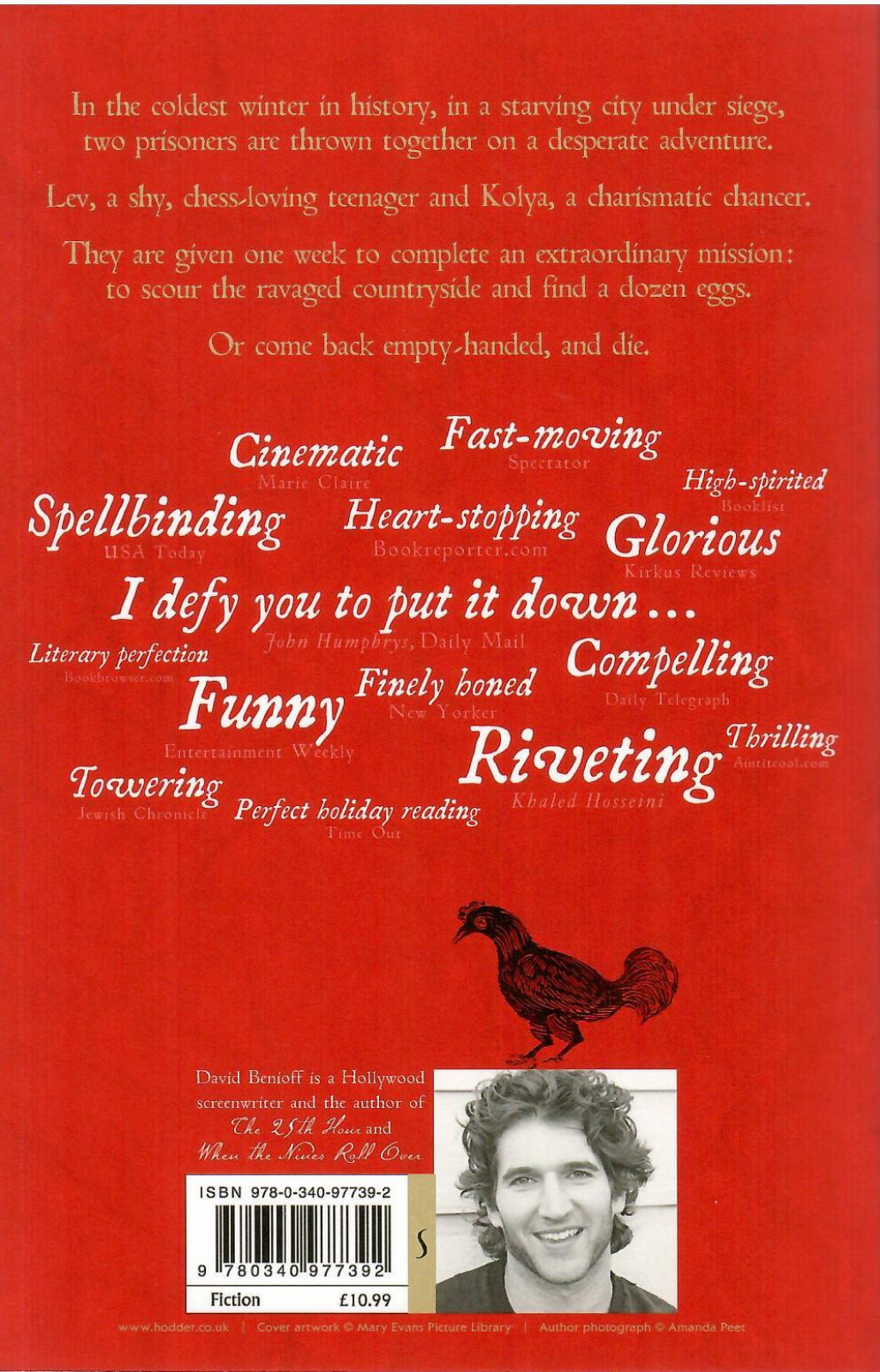 Seventeen-year-old Lev fears for his life when he is arrested for looting the body of a dead German paratrooper, while his charismatic cellmate, Kolya, a handsome young soldier arrested for desertion, seems bizarrely unafraid. Dawn brings, instead of anexecution squad, an impossible challenge. Lev and Kolya can find a dozen eggs for an NKVD colonel to use for his daughter's wedding cake, and live. Or fail, and die.In the depths of the coldest winter in history, through a city cut off from all supplies and suffering appalling deprivation, man and boy embark on an absurd hunt. Their search will take them through desolate, lawless Leningrad and the devastated countryside surrounding it, in the captivating journey of two men trying to survive againstdesperate odds.