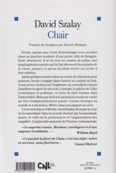 István, quinze ans, vient d'emménager avec sa mere dans un quartier modeste d'une petite ville de Hongrie. Isolé, désoeuvré, c'est par hasard qu'il se lie avec sa voisine de palier, une quadragénaire mariée. Celle-ci lui fait découvrir les plaisirs de la chair, jusqu'a ce qu'un incident mette un terme a leur relation.Apres quelques années dans un centre de détention pour mineurs, István s'engage dans l'armée et combat en Irak. De retour, il part pour l'Angleterre ou, travaillant comme chauffeur et agent de sécurité, il integre la sphere de l'élite économique et politique, et tente de faire fortune dans l'immobilier. Mais par-dela son ascension sociale se cache un etre fondamentalement passif, comme étranger au monde et a lui-meme. Meme dans son rapport au sexe.A travers la figure d'István, David Szalay décrypte la crise de la masculinité dans un monde dominé par la marchandisation, le culte de la performance et l'augmentation des inégalités. L'implacable anatomie de l'homme contemporain.