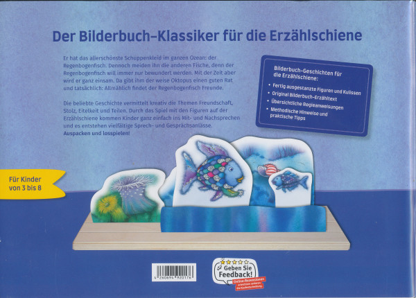 A színes hal kalandja a büszkeség és a hiúság, a megosztás és az adakozás története. A háromdimenziós kialakítás láthatóbbá teszi a szereplők közötti kapcsolatokat, mint egy kétdimenziós képeskönyvben. Ez segít a gyerekeknek felismerni az összefüggéseket és megnevezni a viselkedéseket. Új utat nyit számukra saját érzéseik megértéséhez.Hamarosan világossá válik, hogy mennyire árt magának a szivárványhal a beképzelt viselkedésével – ami utat nyit a barátságról és a társas interakcióról szóló további beszélgetéseknek!