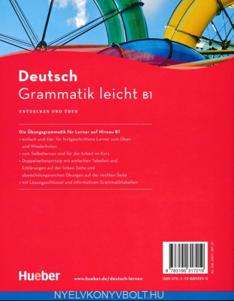Grammatik leicht B1 ist nach dem Doppelseitenprinzip aufgebaut: Auf der ersten Seite wird in das Grammatikthema („Entdecken“) eingeführt, auf der folgenden Seiten wird es mit abwechslungsreichen Übungen trainiert. Im Anhang befinden sich Lösungschlüssel, Grammatiktabellen und Register.