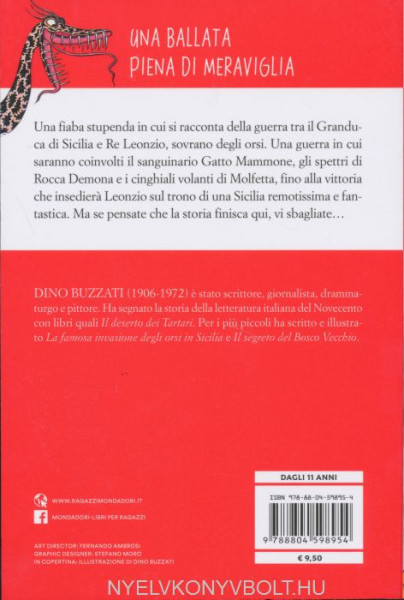 Illustrata dallo stesso Buzzati, e una fiaba in cui si racconta della guerra tra il Granduca di Sicilia e Re Leonzio, sovrano degli orsi. Una guerra in cui saranno coinvolti il sanguinario Gatto Mammone, gli spettri di Rocca Demona e i cinghiali volantidi Molfetta, fino alla vittoria che insediera Leonzio sul trono di una Sicilia remotissima e fantastica. Ma se pensate che la storia finisca qui, vi sbagliate... Eta di lettura: da 11 anni.
