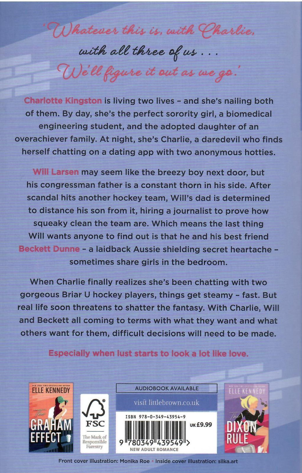 College senior Charlotte Kingston is living two lives - and she's nailing both of them. By day, she's the perfect sorority girl, a STEM student in biomedical engineering, and the adopted daughter of an overachiever family. At night, she's Charlie: a risk-taking daredevil looking for fun who finds herself chatting on a dating app with two anonymous hotties.Will Larsen may seem like the breezy boy next door, but his congressman father is a constant thorn in his side. After a scandal hits another Division 1 hockey program, Will's dad is determined to distance his son from it, hiring a journalist to prove how squeaky-clean Will and his team are. Which means the last thing Will wants is for anyone to find out he and his best friend Beckett Dunne - a laidback Aussie shielding secret heartache - sometimes share girls in the bedroom.When Charlie finally meets them in person and realizes she's been chatting with two gorgeous Briar U hockey players, things get steamy - fast. But all their messy secrets...