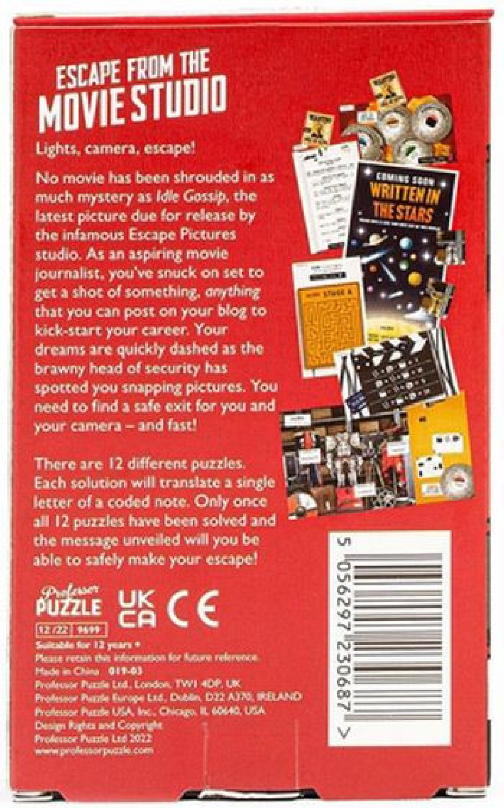 As an aspiring movie journalist, you’ve snuck on set to get a shot of something, anything that you can post on your blog to kick-start your career. Your dreams are quickly dashed as the brawny head of security has spotted you snapping pictures. You needto find a safe exit for you and your camera – and fast!There are 12 different puzzles. Each solution will translate a single letter of a coded note. Only once all 12 puzzles have been solved and the message unveiled will you be able to safely make your escape!