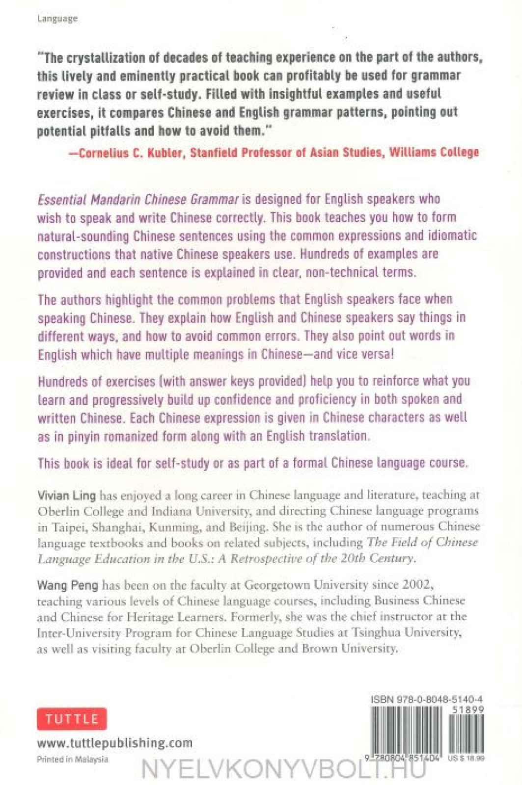 Through explanations of common mistakes learners make, useful example sentences and exercises with an answer key, this book provides a detailed introduction to the unique grammar structures of the Mandarin language.Ideal for any student who is interested in taking their skills to the next level, this book makes the difficult task of perfecting grammar efficient, interesting and rewarding. Essential Mandarin Chinese Grammar is a perfect tool to help you form correct and natural-sounding sentences, anddetermine how to best use the grammar you need for reading or writing Mandarin.