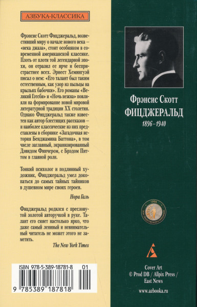 Frensis Skott Fitsdzherald, vozvestivshij miru o nachale novogo veka — «veka dzhaza», stoit osobnjakom v sovremennoj amerikanskoj klassike. Plot ot ploti toj legendarnoj epokhi, on otrazil ee jarche i bespristrastnee vsekh. Ernest Kheminguej pisal o nem: «Ego talant byl takim estestvennym, kak uzor iz pyltsy na kryljakh babochki». Ego romany «Velikij Getsbi» i «Noch nezhna» povlijali na formirovanie novoj mirovoj literaturnoj traditsii XX stoletija. Odnako Fitsdzherald takzhe izvesten kak avtor blestjaschikh rasskazov — i naibolee klassicheskie iz nikh predstavleny v sbornike «Zagadochnaja istorija Bendzhamina Battona», v tom chisle zaglavnyj, ekranizirovannyj Devidom Fincherom, s Bredom Pittom v glavnoj roli.
